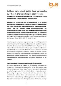 Hannover/Köln, 3. April 2019 – Von der Natur inspiriert, für die Industrie konzipiert: das ist die neue E4Q Energiekette von igus. Die Kettenglieder der e-kette besitzen zur Gewichtsreduktion ein „bachkieselförmiges“ Design und ein komplett neues Öffnungsstegkonzept mit Verschlusslaschen. Diese sorgen dafür, dass die Serie sekundenschnell ohne Werkzeug geöffnet und geschlossen werden kann. Die Energiekette ist speziell für die besonderen Anforderungen von freitragenden Längen und langen Verfahrwegen entwickelt. Den ersten Prototypen stellt igus auf der Hannover Messe 2019 in Halle 17, Stand H04 vor.