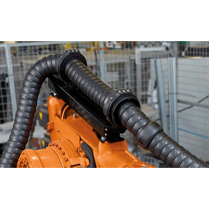 Hohe Rotationen und viele schnelle Bewegungen, so arbeiten Industrieroboter beispielsweise in der Automobilindustrie, um Fahrzeugteile zu montieren. Damit die Leitungen für Daten, Pneumatik und Energieversorgung sicher am Roboter geführt werden, setzen Anwender auf Energieketten. Die triflex R e-ketten von igus spielen hier besonders ihre Vorteile aus, denn sie sind speziell für die Industrierobotik konzipiert und passen sich den dreidimensionalen Bewegungen der Roboter an. Mit der wachsenden Vielfalt in der automatisierten Produktionstechnik gilt es jedoch nicht nur elektrische und pneumatische Leitungen zu führen, sondern auch Schläuche für Bolzen, Nieten und Schrauben. Da diese Schläuche sich nicht mit engen Biegeradien vertragen, ist ein Rückzugsystem für die Energieführung am Roboter gefordert. Daher hat igus jetzt mit triflex RSEL ein neues besonders kostengünstiges Rückzugsystem für seine Energieketten entwickelt. Dieses sorgt dafür, dass die e-kette möglichst kompakt am Roboterarm gehalten wird. Das System verhindert, dass die herabhängende Energieführung die Bewegungen des Roboters beeinflusst oder blockiert, selbst bei hochdynamischen Anwendungen. Denn im schlimmsten Falle wäre durch eine Schlaufenbildung die Beschädigung der Energiekette, der darin liegenden Leitungen und Schläuche und damit ein Maschinenausfall die Konsequenz.