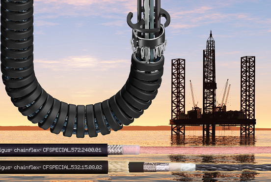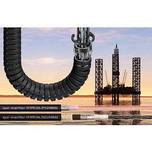 Köln, 26. November 2020 – Speziell für den hängenden Einsatz in besonders herausfordernden Anwendungen wie Tiefbohranlagen hat igus den e-loop entwickelt. Das äußerst robuste Energieketten-System führt Leitungen vertikal sicher und ersetzt bereits heute weltweit immer mehr Service Loops. Mit der neuen CFSPECIAL.5 Serie gibt es nun auch das passende igus Leitungsprogramm für den e-loop. Eine Kombination aus sieben chainflex Leitungen macht Kosteneinsparungen von 35 Prozent möglich.