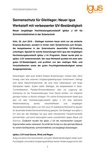 Köln, 29. Juni 2018 – Gleitlager kommen heute nicht nur als einfache Einpress-Buchsen, sondern in immer mehr Sonderformen zum Einsatz, die beispielsweise in der Solarindustrie dauerhafter UV-Strahlung unterliegen. Speziell für solche Anwendungen führt igus den langlebigen Hochleistungskunststoff iglidur J im Programm. Dieser wurde jetzt zu iglidur J UV weiterentwickelt. Der neue Werkstoff punktet mit einer sehr guten UV-Beständigkeit, und profitiert von den niedrigen Reib- und Verschleißwerten sowie der guten Feuchtigkeitsbeständigkeit seines Ausgangsmaterials.