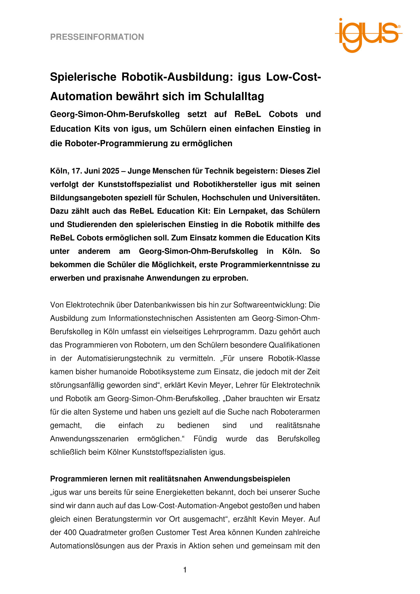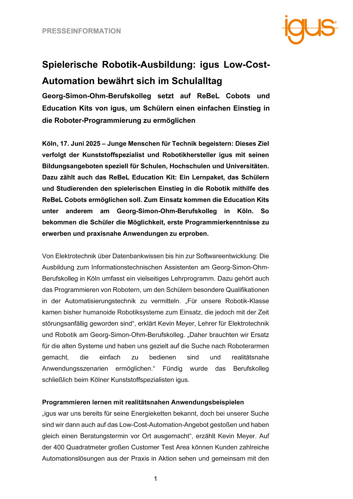 Köln, 17. Juni 2025 – Junge Menschen für Technik begeistern: Dieses Ziel verfolgt der Kunststoffspezialist und Robotikhersteller igus mit seinen Bildungsangeboten speziell für Schulen, Hochschulen und Universitäten. Dazu zählt auch das ReBeL Education Kit: Ein Lernpaket, das Schülern und Studierenden den spielerischen Einstieg in die Robotik mithilfe des ReBeL Cobots ermöglichen soll. Zum Einsatz kommen die Education Kits unter anderem am Georg-Simon-Ohm-Berufskolleg in Köln. So bekommen die Schüler die Möglichkeit, erste Programmierkenntnisse zu erwerben und praxisnahe Anwendungen zu erproben.
