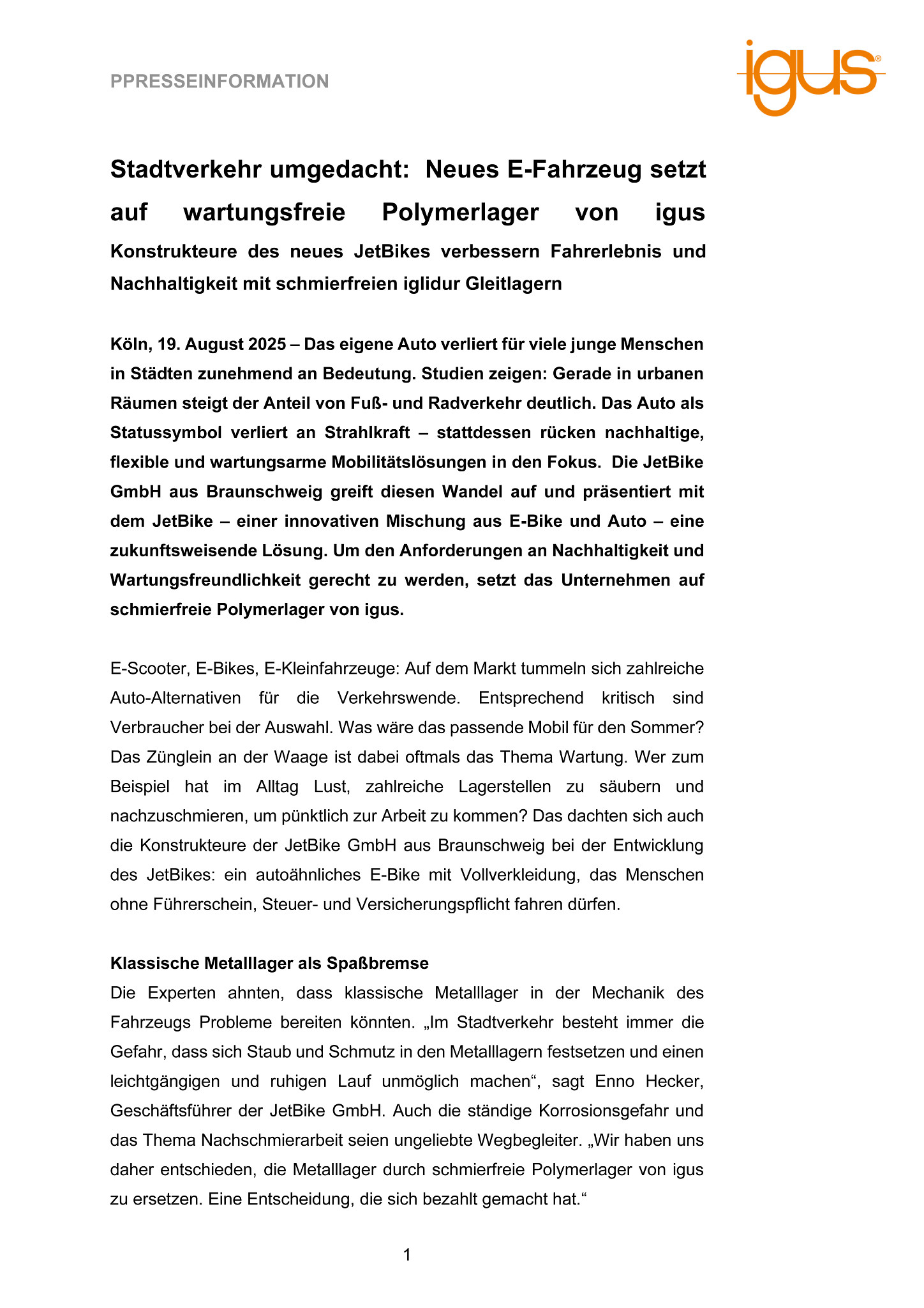 Köln, 19. August 2025 – Das eigene Auto verliert für viele junge Menschen in Städten zunehmend an Bedeutung. Studien zeigen: Gerade in urbanen Räumen steigt der Anteil von Fuß- und Radverkehr deutlich. Das Auto als Statussymbol verliert an Strahlkraft – stattdessen rücken nachhaltige, flexible und wartungsarme Mobilitätslösungen in den Fokus. Die JetBike GmbH aus Braunschweig greift diesen Wandel auf und präsentiert mit dem JetBike – einer innovativen Mischung aus E-Bike und Auto – eine zukunftsweisende Lösung. Um den Anforderungen an Nachhaltigkeit und Wartungsfreundlichkeit gerecht zu werden, setzt das Unternehmen auf schmierfreie Polymerlager von igus.