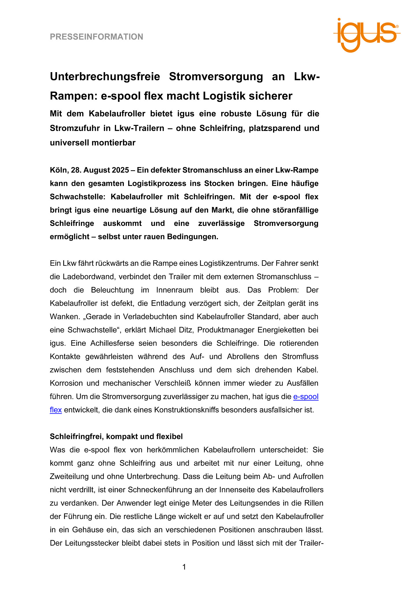 Köln, 28. August 2025 – Ein defekter Stromanschluss an einer Lkw-Rampe kann den gesamten Logistikprozess ins Stocken bringen. Eine häufige Schwachstelle: Kabelaufroller mit Schleifringen. Mit der e-spool flex bringt igus eine neuartige Lösung auf den Markt, die ohne störanfällige Schleifringe auskommt und eine zuverlässige Stromversorgung ermöglicht – selbst unter rauen Bedingungen.