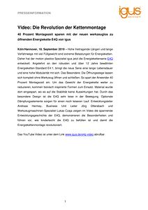 Köln/Hannover, 18. September 2019 – Hohe freitragende Längen und lange Verfahrwege mit viel Füllgewicht sind extreme Belastungen für Energieketten. Daher hat der motion plastics Spezialist igus jetzt die Energiekettenserie E4Q entwickelt. Angelehnt an den robusten und über 12 Jahre bewährten Energieketten-Standard E4.1, bringt die neue Serie eine lange Lebensdauer und eine hohe Modularität mit sich. Das Besondere: Die Öffnungsstege lassen sich komplett ohne Werkzeug öffnen und schließen. So spart der Anwender 40 Prozent Montagezeit ein. Um das Gewicht der Energiekette weiter zu reduzieren, kommen bionisch inspirierte Formen zum Einsatz. Material wurde dort eingespart, wo es auf die Stabilität keine Auswirkungen hat. Durch das besondere Design ist die E4Q sehr leise in der Bewegung. Optionale Dämpfungselemente sorgen für einen noch leiseren Lauf. Entwicklungsleiter Andreas Hermey, Business Unit Leiter Jörg Ottersbach und Werkzeugmaschinen-Spezialist Lukas Czaja zeigen im Video die spannende Entwicklungsgeschichte der E4Q, demonstrieren die Besonderheiten und führen vor, wie kinderleicht die E4Q zu befüllen ist und damit die Energiekettenmontage revolutioniert.