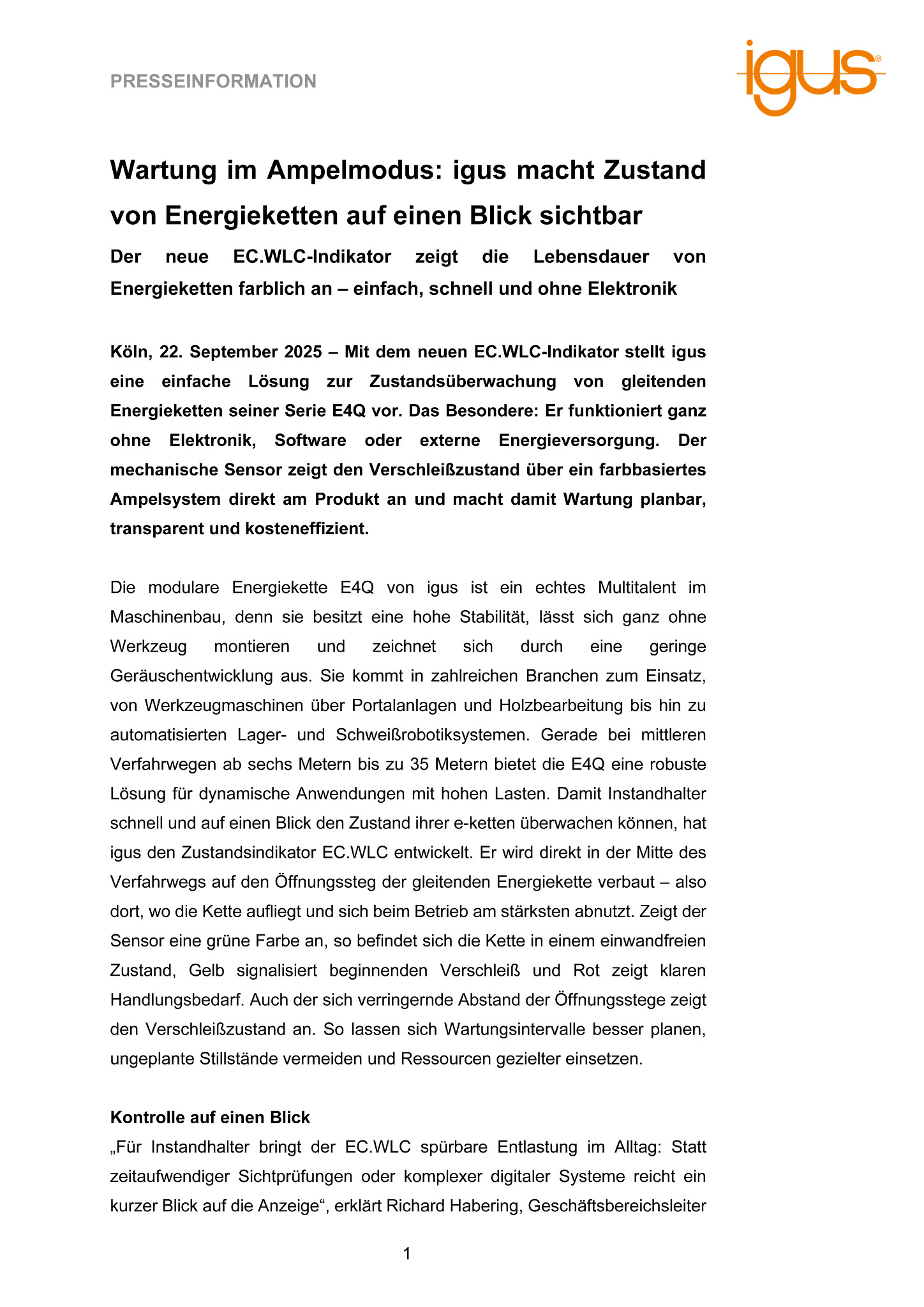 Köln, 22. September 2025 – Mit dem neuen EC.WLC-Indikator stellt igus eine einfache Lösung zur Zustandsüberwachung von gleitenden Energieketten seiner Serie E4Q vor. Das Besondere: Er funktioniert ganz ohne Elektronik, Software oder externe Energieversorgung. Der mechanische Sensor zeigt den Verschleißzustand über ein farbbasiertes Ampelsystem direkt am Produkt an und macht damit Wartung planbar, transparent und kosteneffizient.