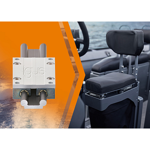 Bereits seit sieben Jahren entwickelt das polnische Unternehmen Kaj Naval Sitze für Motorboote. Bei der neusten Sitzvariante setzten die Konstrukteure für den gefederten Stoßdämpfungsweg auf eine drylin W Linearführung. Diese sorgt für ein sanftes Gleiten des Sitzes selbst bei hohen Geschwindigkeiten und nimmt die Schwingungen der Wellen auf. Der Führungsschlitten besitzt durch den Einsatz von Gleitelementen aus Tribo-Polymeren kein seitliches Spiel und zeigt selbst nach einer langen Betriebszeit keinen Verschleiß auf. Ein weiterer Vorteil: Die korrosionsfreie Lösung von igus ist im Vergleich zu metallischen Alternativen wie Kugelumlaufführungen wartungs- sowie schmiermittelfrei und wesentlich leichter.
