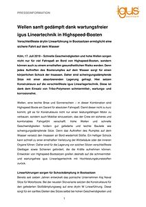 Köln, 17. Juli 2019 – Schnelle Geschwindigkeiten und hohe Wellen sorgen nicht nur für viel Fahrspaß an Bord von Highspeed-Booten, sondern können auch zu einem ernsthaften gesundheitlichen Risiko werden. Denn jedes Auftreffen des Bootsrumpfes auf dem Wasser sorgt für einen körperlichen Schock der Insassen. Daher sind schwingungsdämpfende Sitze mit einer absorbierenden Lagerung gefragt. Hier setzen Konstrukteure auf die verschleißfeste igus Linearlagertechnik. Diese ist dank dem Einsatz von Tribo-Polymeren schmiermittel-, wartungs- und korrosionsfrei.