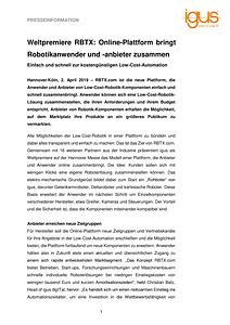 Hannover/Köln, 2. April 2019 – RBTX.com ist die neue Plattform, die Anwender und Anbieter von Low-Cost-Robotik-Komponenten einfach und schnell zusammenbringt. Anwender können sich eine Low-Cost-Robotik-Lösung zusammenstellen, die ihren Anforderungen und ihrem Budget entspricht. Anbieter von Robotik-Komponenten erhalten die Möglichkeit, auf dem Marktplatz ihre Produkte an ein größeres Publikum zu vermarkten.
