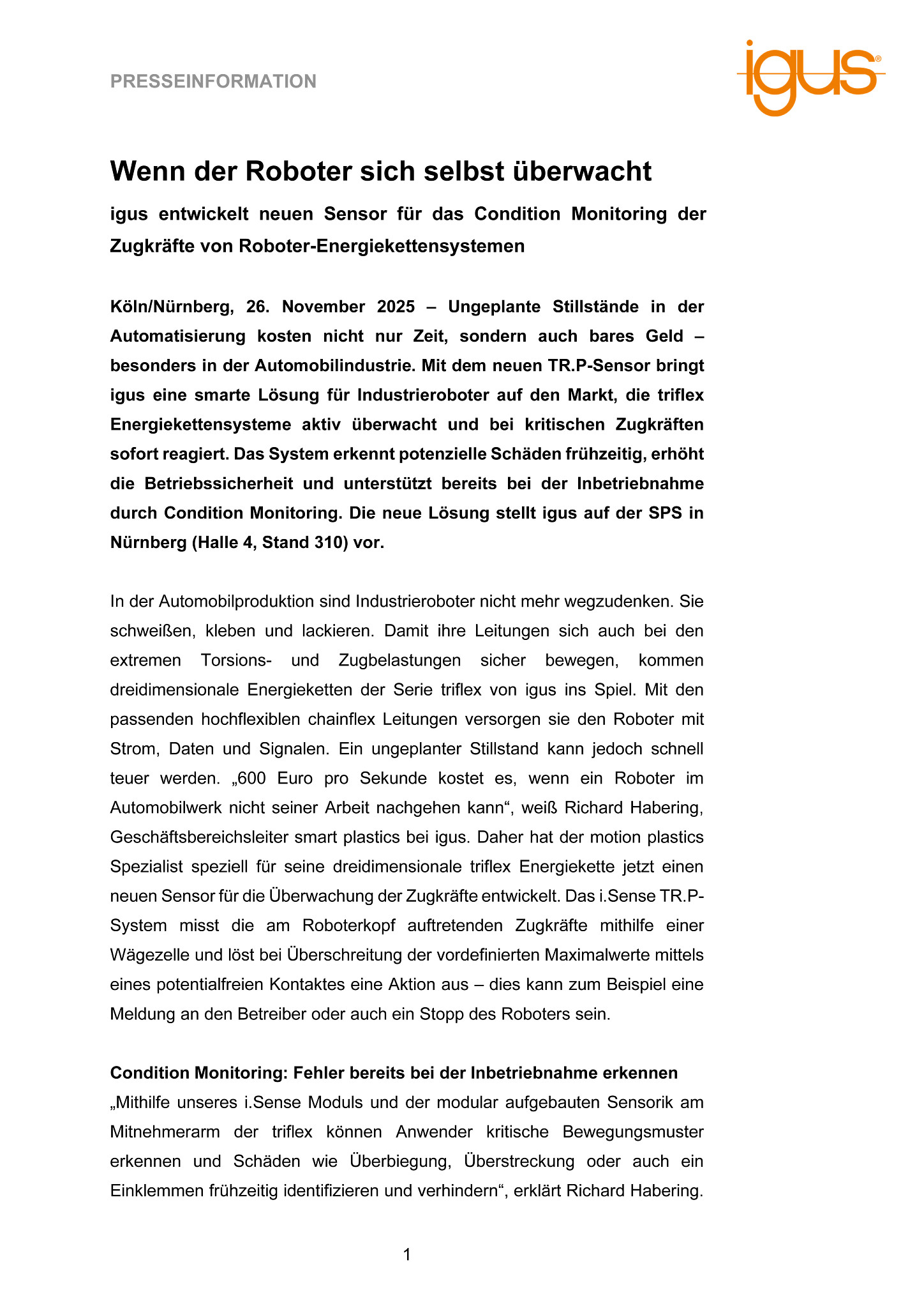 Köln/Nürnberg, 25. November 2025 – Ungeplante Stillstände in der Automatisierung kosten nicht nur Zeit, sondern auch bares Geld – besonders in der Automobilindustrie. Mit dem neuen TR.P Sensor bringt igus eine smarte Lösung für Industrieroboter auf den Markt, die triflex Energiekettensysteme aktiv überwacht und bei kritischen Zugkräften sofort reagiert. Das System erkennt potenzielle Schäden frühzeitig, erhöht die Betriebssicherheit und unterstützt bereits bei der Inbetriebnahme durch Condition Monitoring.