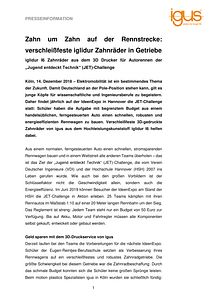 Köln, 14. Dezember 2018 – Elektromobilität ist ein bestimmendes Thema der Zukunft. Damit Deutschland an der Pole-Position stehen kann, gilt es junge Köpfe für wissenschaftliche und Ingenieursberufe zu begeistern. Daher findet jährlich auf der IdeenExpo in Hannover die JET-Challenge statt: Schüler haben die Aufgabe mit begrenztem Budget aus einem handelsüblichen, ferngesteuerten Auto einen schnellen, robusten und energieeffizienten Rennwagen zu bauen. Verschleißfeste 3D-gedruckte Zahnräder von igus aus dem Hochleistungskunststoff iglidur I6 helfen dabei.