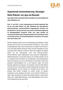 Einfache Aufgaben schnell, leicht und kostengünstig automatisieren: Dieses Ziel geht igus mit seinen Low Cost Automation Produkten an. Jetzt hat der Kunststoffspezialist neben seinen Raumportalen ein komplett neues Produkt in Form eines Delta Roboters entwickelt. Dieser wird dem Fachpublikum auf der automatica 2018 in München in Halle A4, Stand 103 vorgestellt. Der Roboter basiert auf drei wartungsfreien drylin ZLW Zahnriemenachsen, schmiermittelfreien igubal Koppelstangen sowie passenden Adapterplatten. NEMA Schrittmotoren und Encoder sorgen für ein schnelles Handling von bis zu 1 Kilogramm bei einer Präzision von ± 0,5 Millimetern. Das komplette System besitzt einen Bauraum von bis zu 420 Millimetern Durchmesser und kann bei geringeren Geschwindigkeiten bis zu fünf Kilogramm tragen. Die leichte Bauweise, bestehend aus Aluminium und Kunststoff, macht den Delta Roboter mit einem Preis von unter 5.000 Euro äußerst kostengünstig und sorgt für hohe Geschwindigkeiten mit einer Pickrate von mindestens 60 pro Minute. „Der günstige Delta Roboter ermöglicht es unseren Kunden mit eigenem Schaltkasten und der Integration bei Kosten um die 10.000 bis 15.000 Euro zu liegen. Diese amortisieren sich bereits nach wenigen Monaten, maximal einem halben Jahr“, erklärt Stefan Niermann, Leiter Geschäftsbereich drylin Linear- und Antriebstechnik bei der igus GmbH.